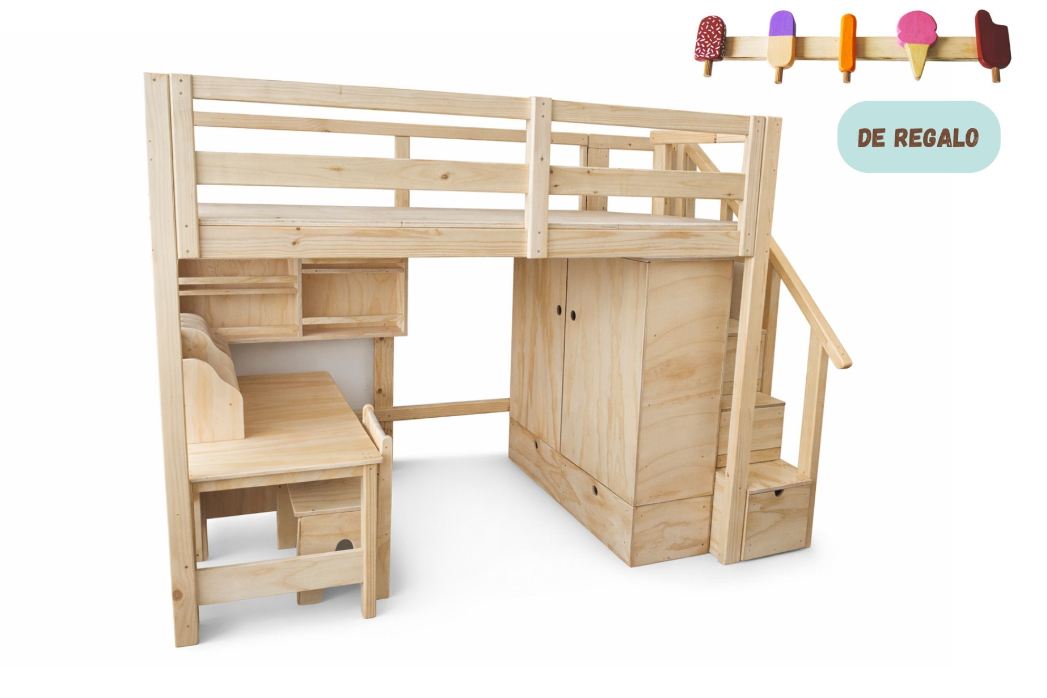 Cama alta con baranda fija o desmontable, escalera con cajones, clóset de 2 puertas con repisas interiores, barra para colgar y 2 cajones inferiores; escritorio modelo Matilde con silla y librero aéreo.