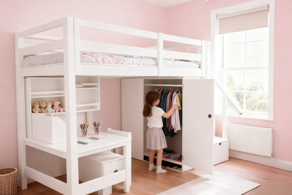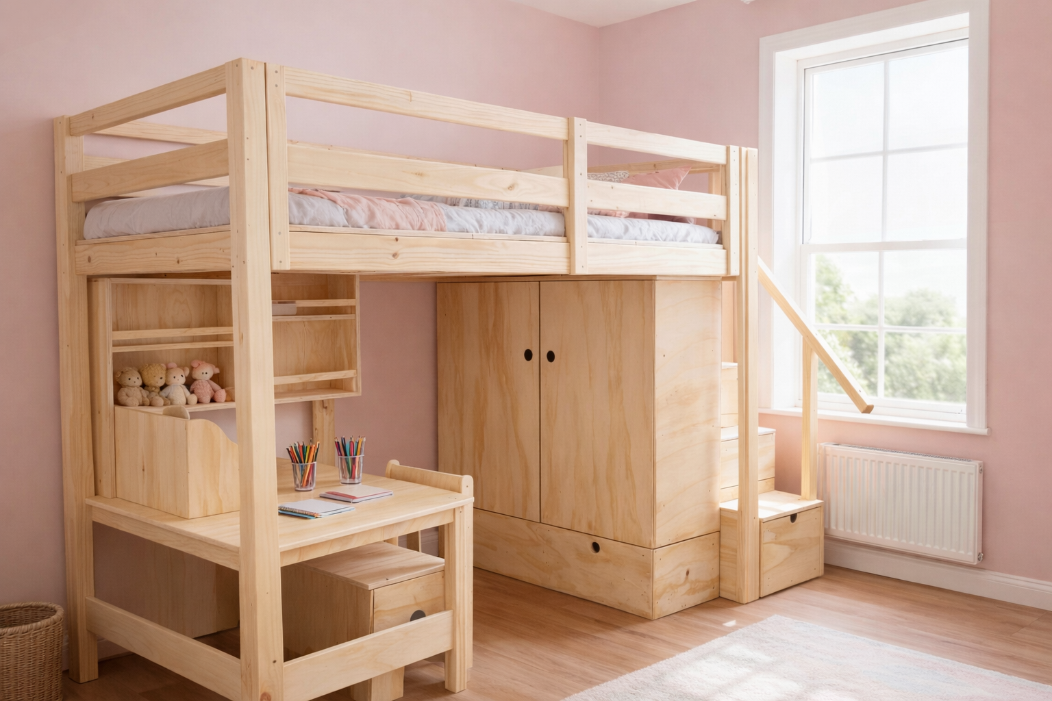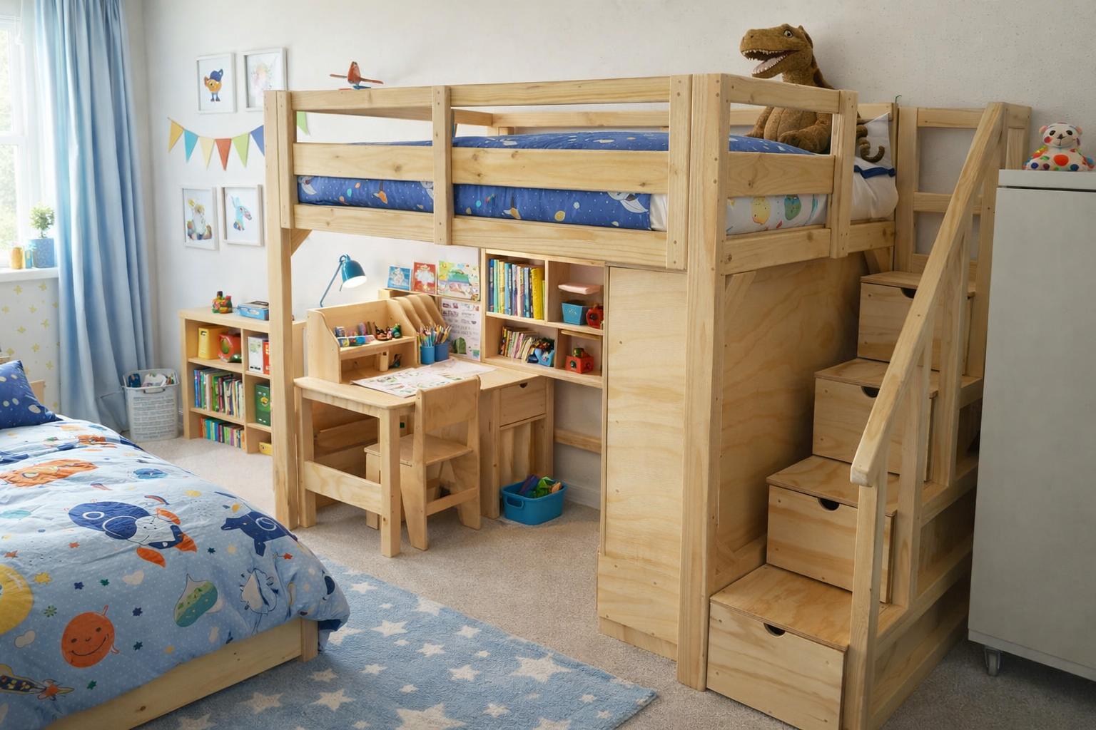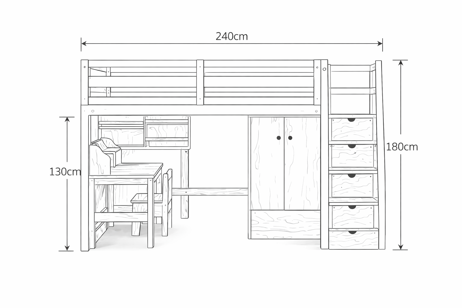 Con este proyecto de cama loft se acabaron tus problemas de almacenamiento de ropa, su clóset de doble puerta con repisas, barra y cajones es la solución ideal para guardar la ropita de tu hijo o hija, y si eso no es suficiente los 4 cajones de la escalera serán el complemento perfecto; un escritorio con compartimentos, cajón y repisa ofrece el espacio perfecto para que tu pequeña/o pueda concentrarse en sus deberes; y la repisa áerea lateral será el lugar preferido para guardar peluches o tener siempre a la mano esos libros que encantan.