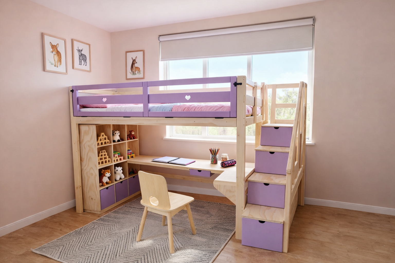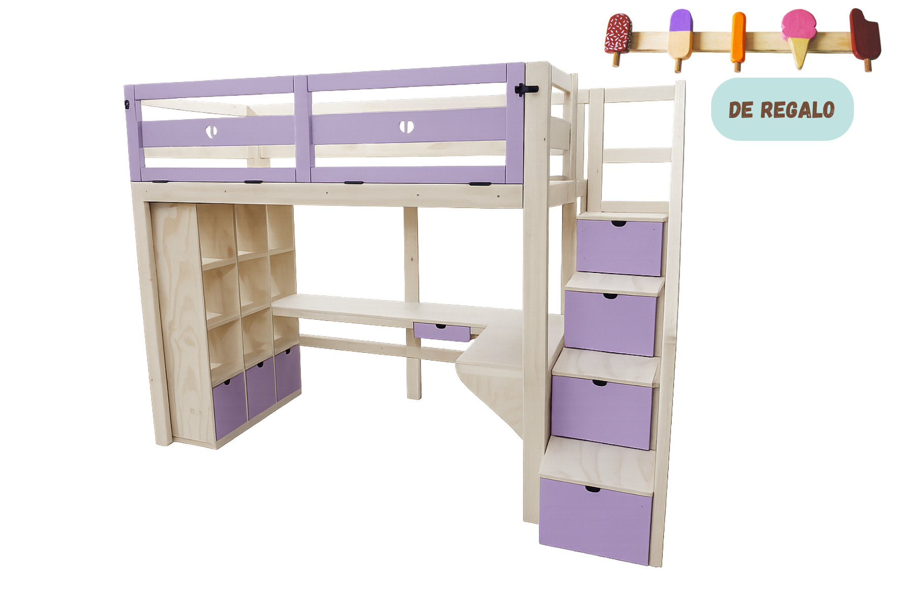 Cama alta con baranda abatible, escalera con cajones con pasamanos para subir y bajar con facilidad; organizador con 3 cajas y escritorio en L con pequeño cajón. Elección de color para tapas de cajas, cajones y baranda abatible.